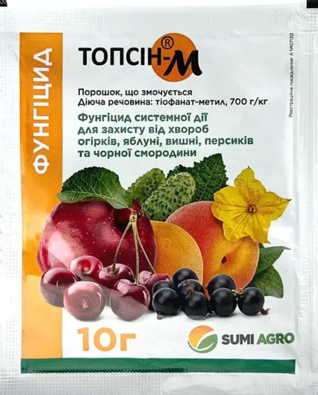 Опис Топсин–М – системний фунгіцид для лікування і профілактики огірків, чорної смородини, яблунь, вишень, персиків від грибкових інфекцій: борошнистої роси, церкоспорозу, моніліозу, коккомікозу, парші, антракнозу, фузаріозу. Негативно впливає на ґрунтових нематод, на низку видів попелиць.