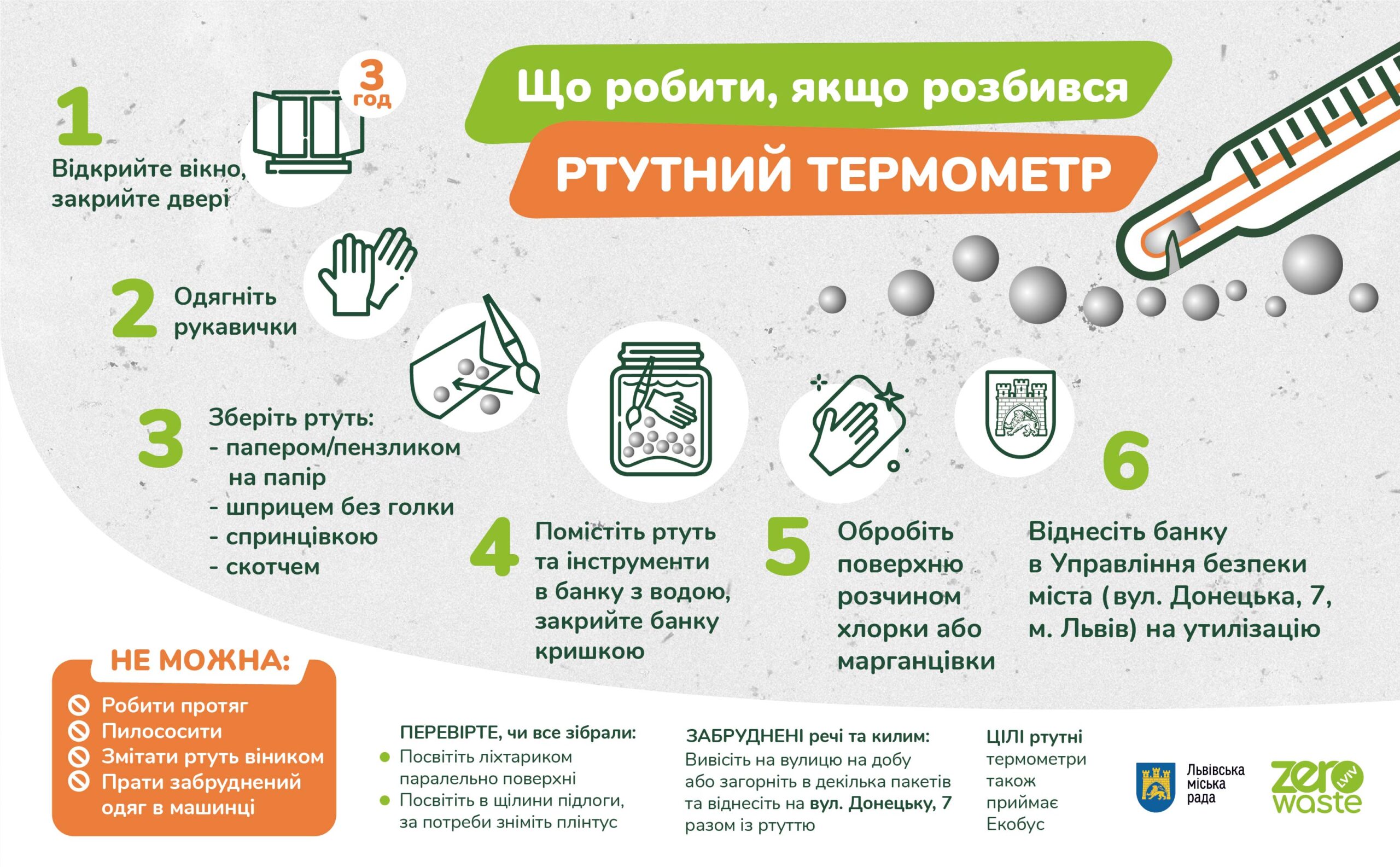 Відразу відчинити кватирки, вікна, двері для покращення вентиляції. Ретельно провітрювати приміщення необхідно протягом 5-7 днів. Двері в інші кімнати необхідно зачинити на час проведення робіт зі збору (видалення) ртуті.