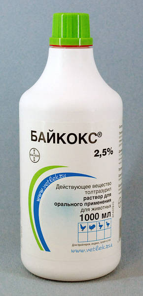 Байкокс, 1 мл – препарат для лікування або профілактики кокцидіозу у різних видів с/г птиц: гусей, качок, індичок, молодняку курей, бройлерів.