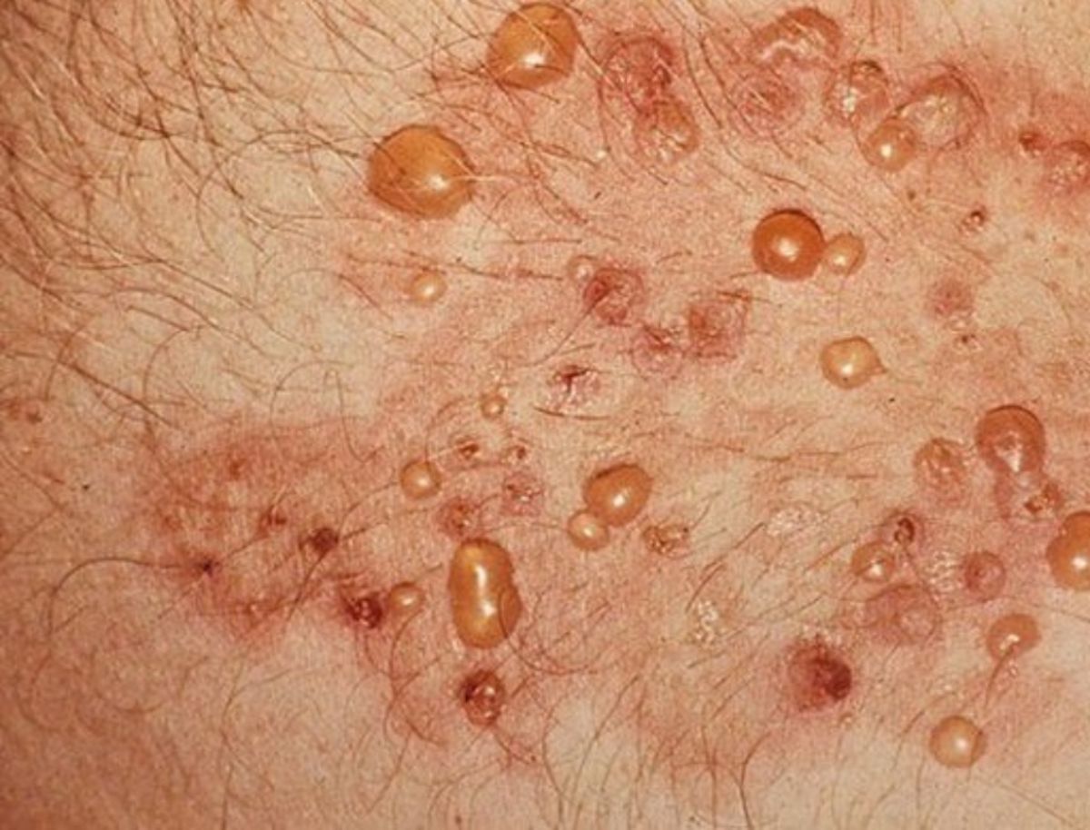 За цього дерматозу формуються пухирі, що згодом зливаються та поширюються на всю поверхню шкіри. Необхідне застосування глюкокортикоїдів, напри …