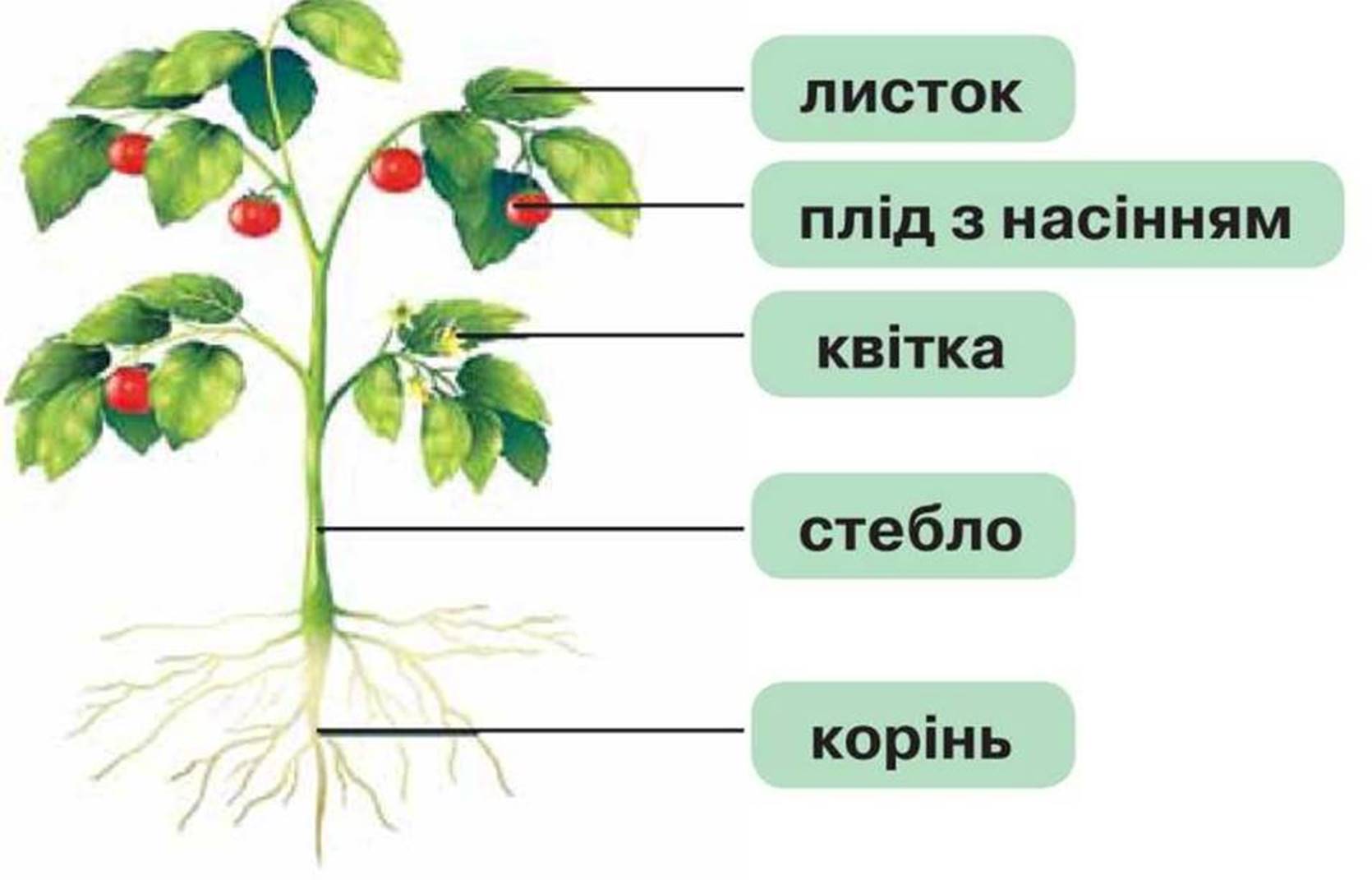 Корінь, стебло, листя, квіти, плід з насінням — це органи рослини. Корінь знаходиться в ґрунті. Він вбирає з нього вологу та поживні речовини, закріплює рослину в ґрунті. Стебло — орган рослини, розташований над ґрунтом.