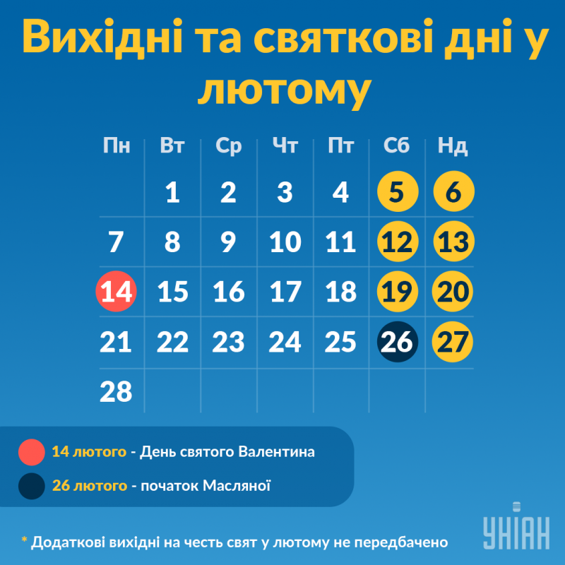 У лютому 2022 року буде 28 днів, так як цей рік не високосний. Українців чекає 20 робочих днів і 8 вихідних. Вихідними будуть: 5, 6, 12, 13, 19, 20, 26, 27 чис …