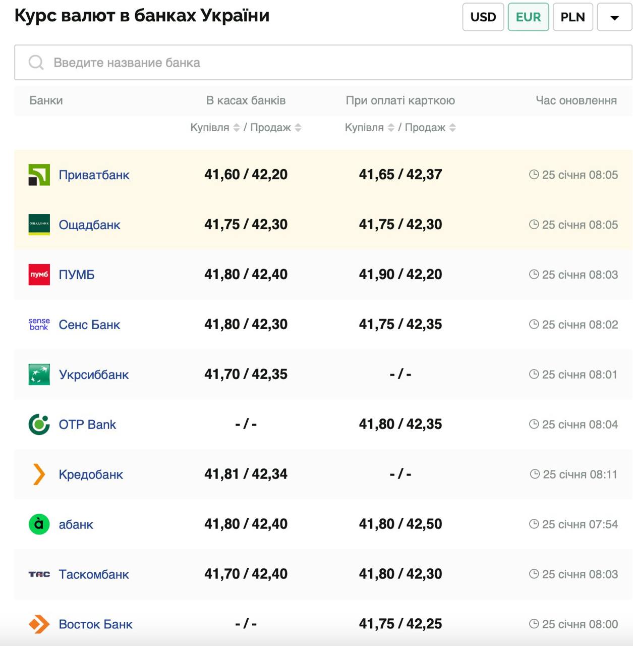 Січень 2025. Курс валют Січень 2025. Дата, Курс $, Курс €. 31.01.2025, 41.730, 43.320. 30.01.2025, 41.840, 43.600. 29.01.2025, 41.950, 43.710. 28.01.2025 …