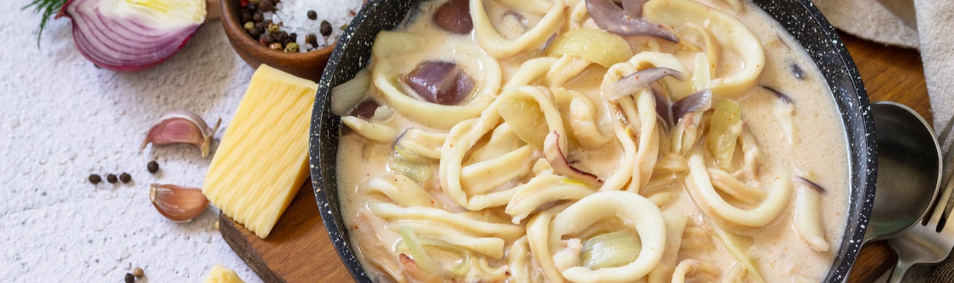800 г кальмарів · 100 мл вершків 33% · 1 велика цибулина · 2 зубчика часнику · Трішечки петрушки · 1 ст. л. оливкової олії · Сіль, суміш перців …