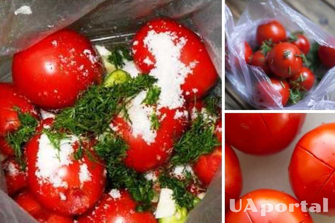 Помідори складіть у пакет, додайте часник і зелень. Додайте сіль, цукор, перець горошком і зав'яжіть пакет (або застібніть застібку). Акуратно помніть пакет у руках, щоб спеції та зелень рівномірно перемішалися. Покладіть пакет з помідорами у глибоку миску й залиште на одну годину.